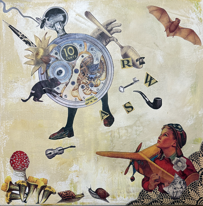 Acrylic & Collage on Canvas, 2022, 10″ x 10″ x 2″